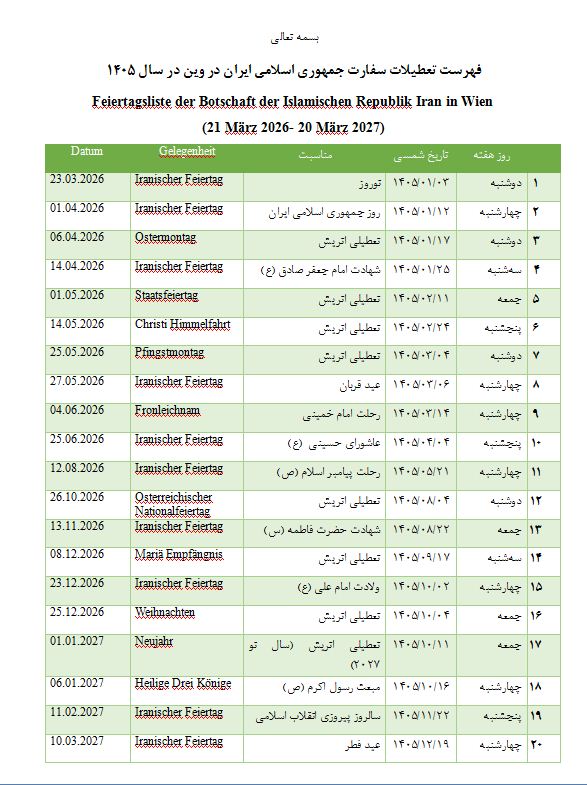 فهرست تعطیلات سفارت جمهوری اسلامی ایران در وین در سال 1405