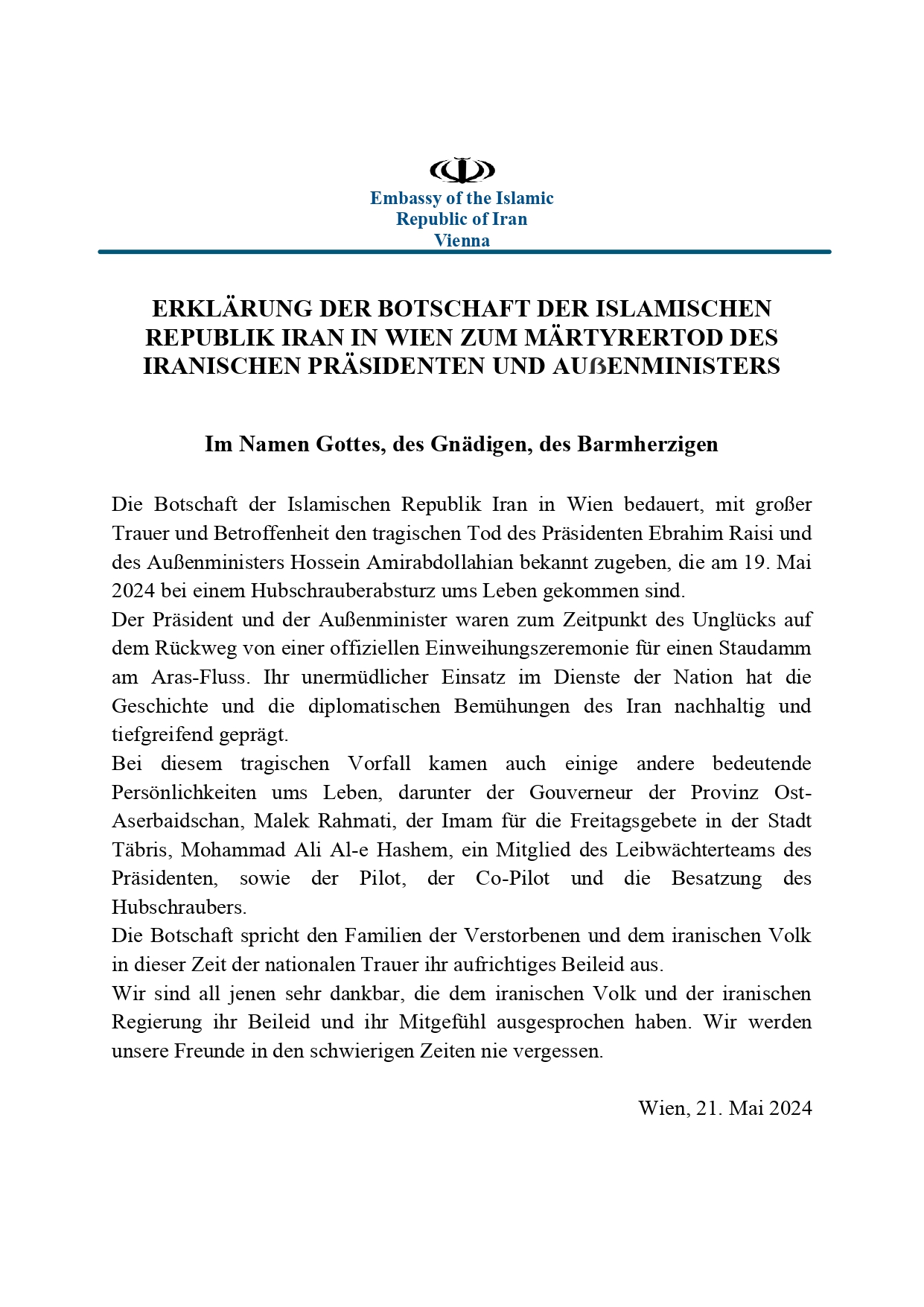 ERKLÄRUNG DER BOTSCHAFT DER ISLAMISCHEN REPUBLIK IRAN IN WIEN ZUM MÄRTYRERTOD DES IRANISCHEN PRÄSIDENTEN UND AUẞENMINISTERS